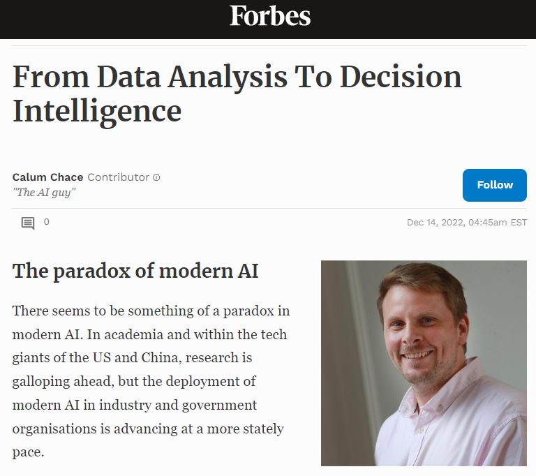 A recent study by McKinsey found that some companies are using AI to obtain cost savings of 90% and revenue increases of 70%. With this type of opportunity, it is odd that AI systems are not yet more widely deployed. At some point in the not-too distant future, deployment will be widespread, and everyone will have to adopt it. But for the time being, Steve has to do a great deal of explaining of how his algorithms work before clients are ready to trust him to put a system into operation. This job of explaining is made more challenging when it is done by PhDs talking to extremely busy executives who are very bright, but do not understand the maths. A great data scientist is someone who can follow the detailed workings of an algorithm, and can also convert the important insights it generates into a compelling story for non-technical people. In other words, decision intelligence.