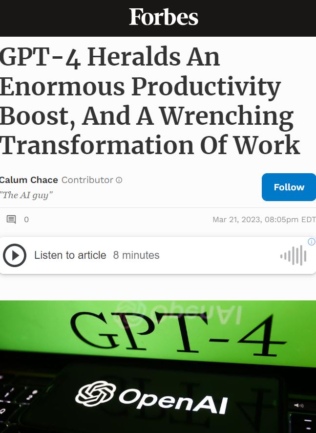Launched on 14 March, GPT-4 is a genuine game changer. It seems likely that over the next few months, Generative Pretrained Transformer (GPT) AI models will transform the nature of work for many of us. They are still (probably) a long way from artificial general intelligence and superintelligence. They are not conscious, and they do not “understand” what they are doing. But GPT-4 is a big improvement in natural language programming. Like ChatGPT, it was trained on vast amounts of data, but unlike ChatGPT, it can also ingest a lot of customer data, which makes a big difference.